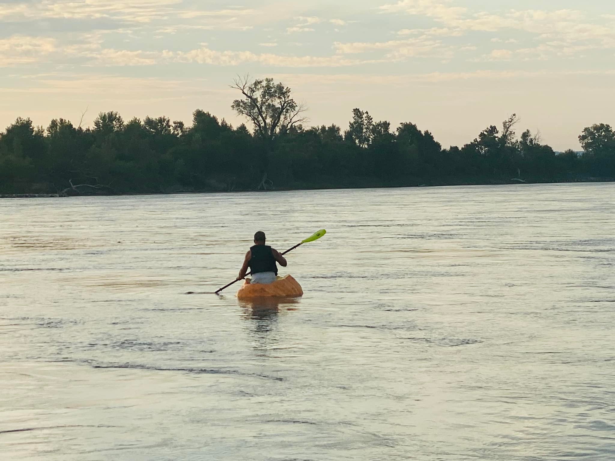 A Nebraska man paddled 38 miles down the Missouri River on Saturday in a "boat" made from a hollowed out pumpkin to celebrate his 60th birthday and set a Guinness World Record.